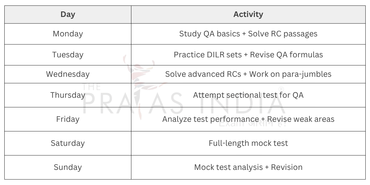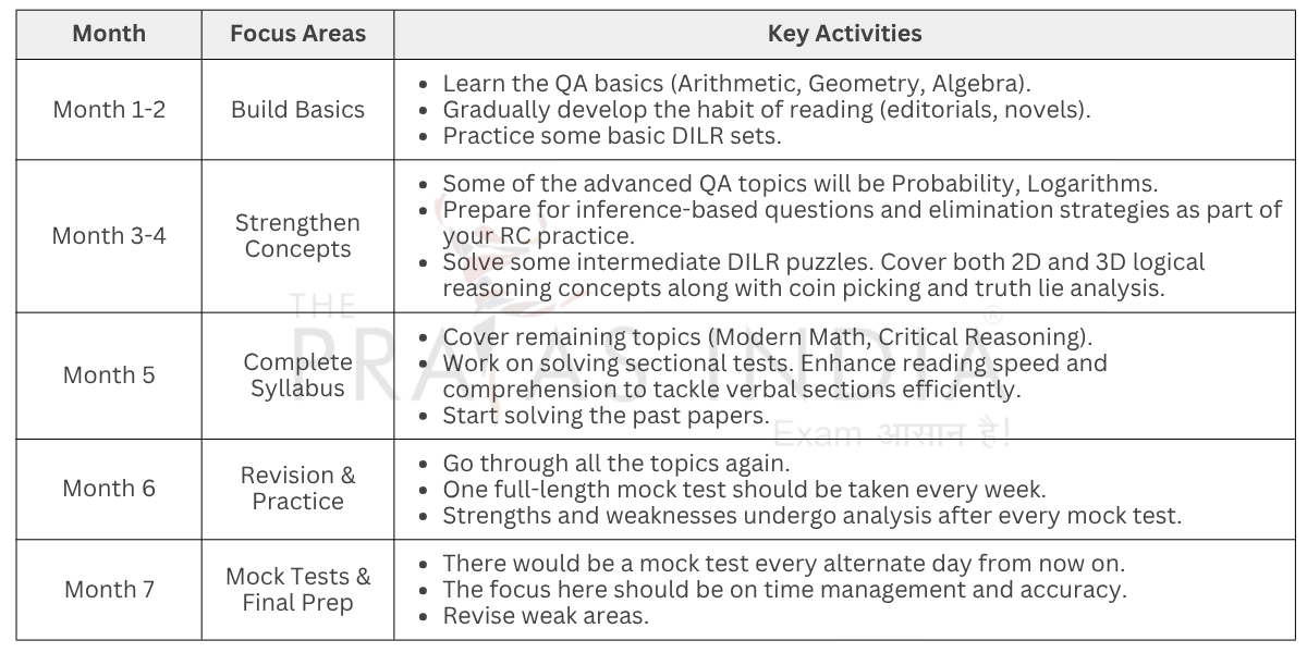 • Months 1–2: Build fundamentals (basic concepts in QA, reading habits for VARC, basic puzzles for DILR)