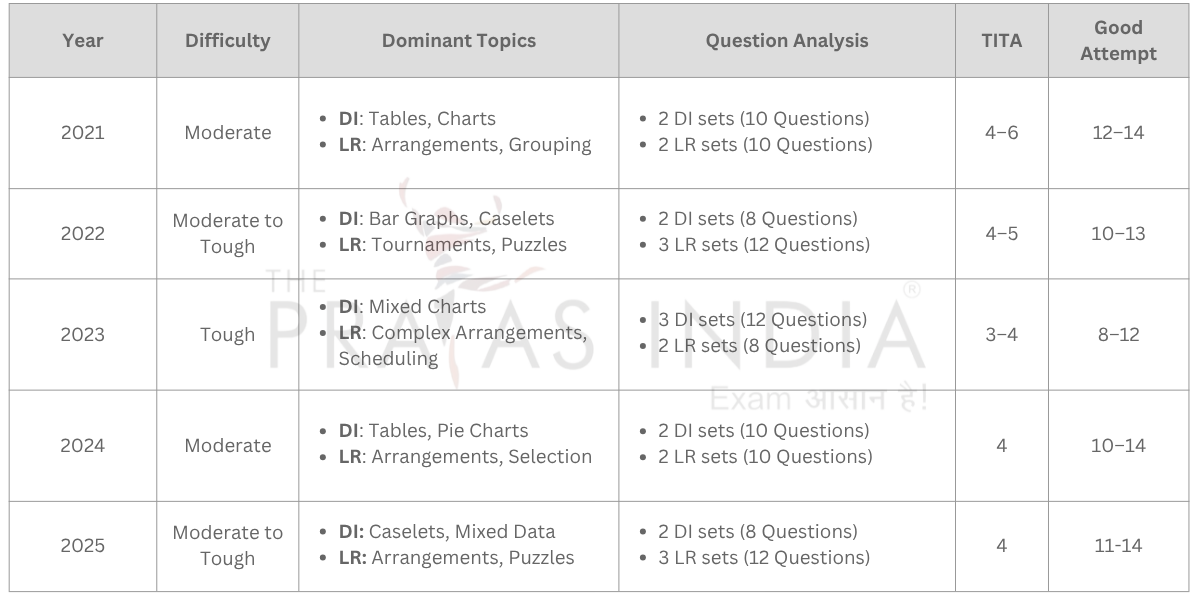The following table provides a comprehensive analysis of the DILR section from 2021 to 2025, compiled by our experienced faculty.